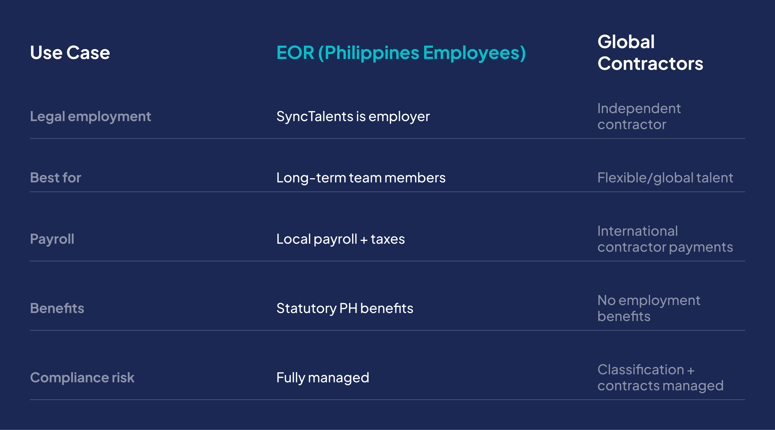 SyncTalents helps you expand globally without legal entities. Use EOR for full-time employees in the Philippines and Global Contractor solutions for compliant international freelance and contractor engagements.